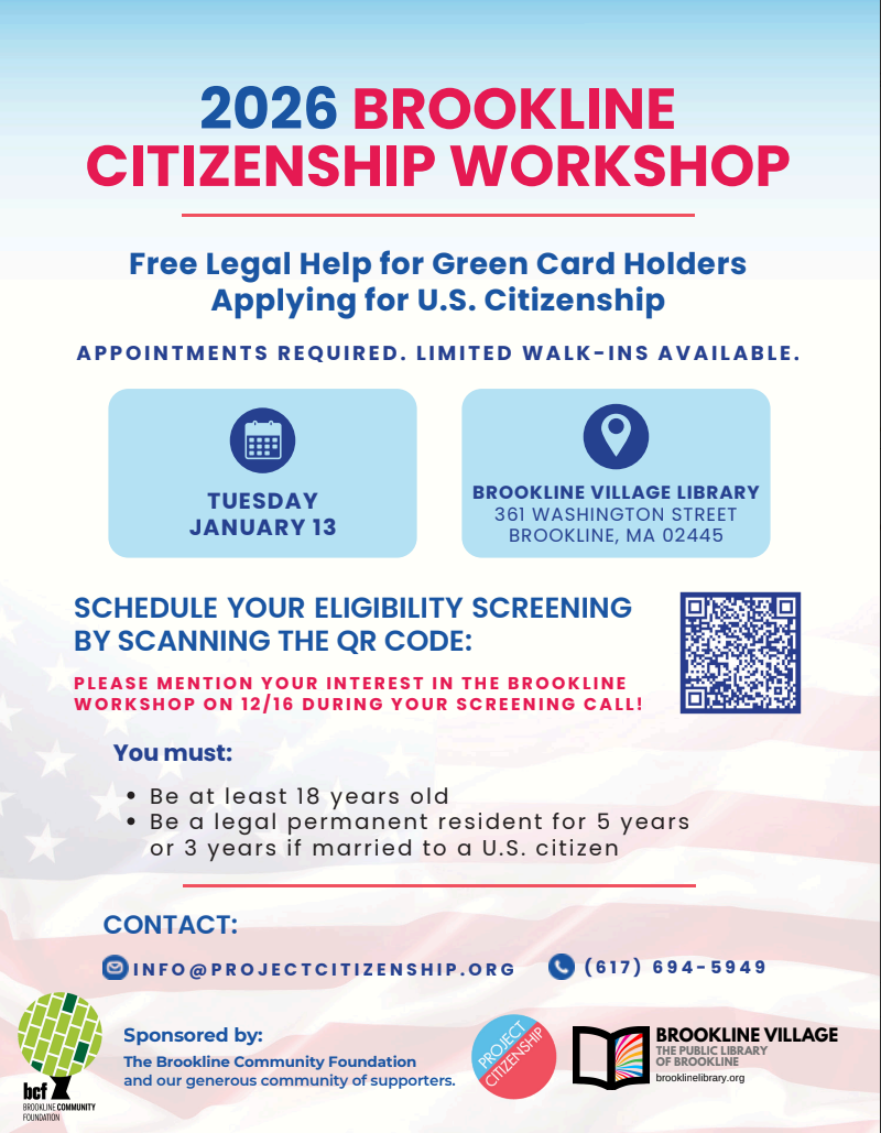 Commemorate Russian Poet, Korzhavin (Coolidge Corner) - Saturday, December 20 at 1:00 PMProject Citizen Info Table (Brookline Village) - Tuesday, January 6 at 2:00 PM